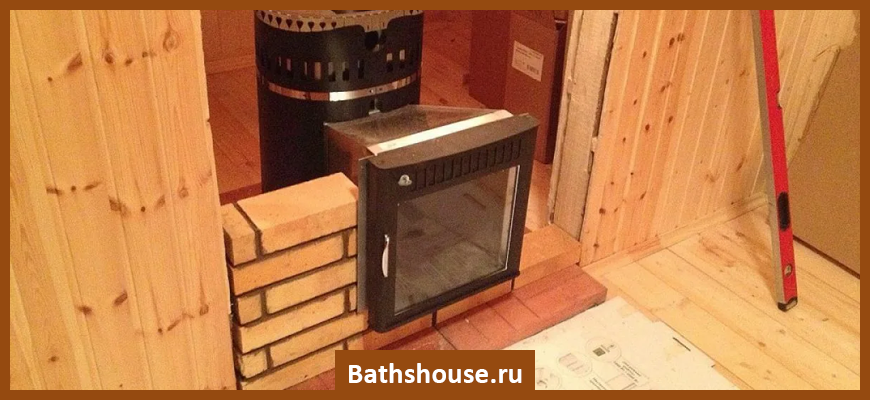 Топка может быть выведена со стеной предбанника на один уровень либо оставлена заглубленной в проеме, что является более предпочтительным. Способ безопасен, так как дверца топки при таком расположении не сможет стать причиной ожога.