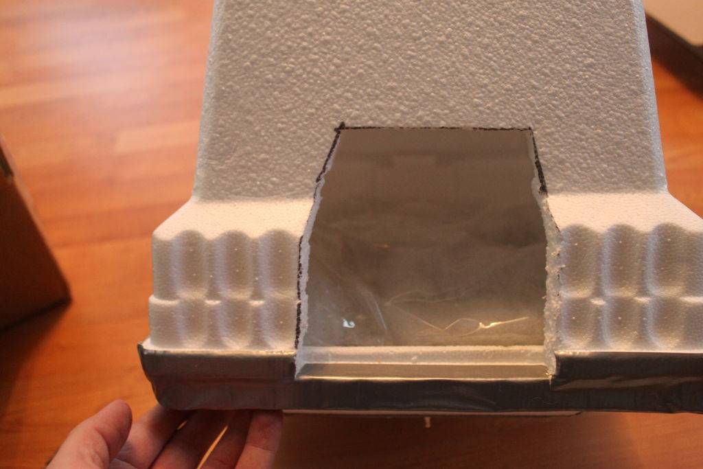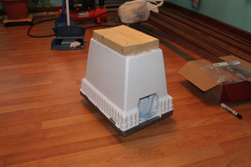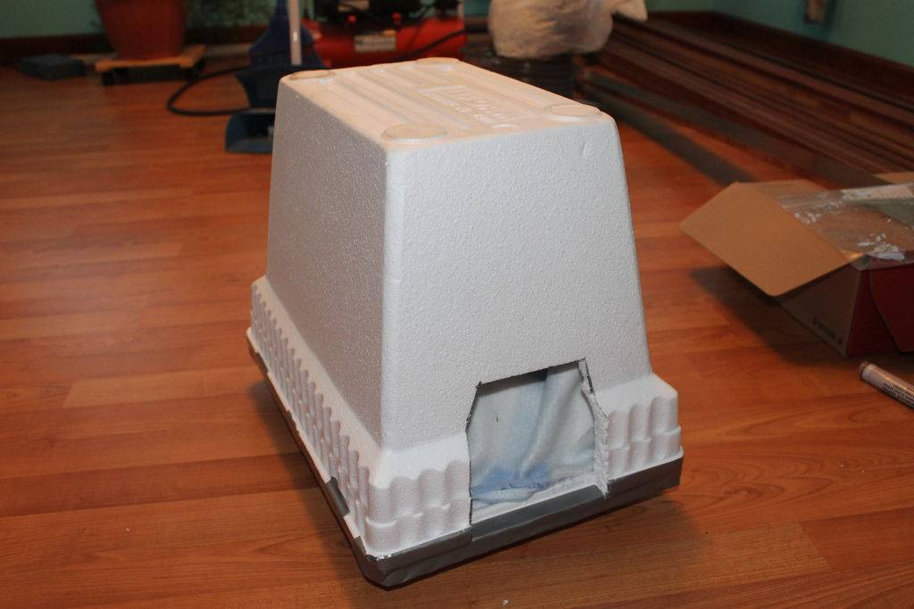 Пол и стены с помощью скотча лучше обклеить пенополистеролом, поскольку он имеет наибольший срок службы, и при этом меньше пропускает влагу. Затем весь короб обматывают водонепроницаемым покрытием, которое защитит утеплитель от воды и кошачьих когтей. Места стыков скрепляют широкой лентой скотча. Вход в домик прикрывают войлочной материей. Пол рекомендуют сверху застелить флисовой тканью, она высыхает быстрее, чем шерсть.